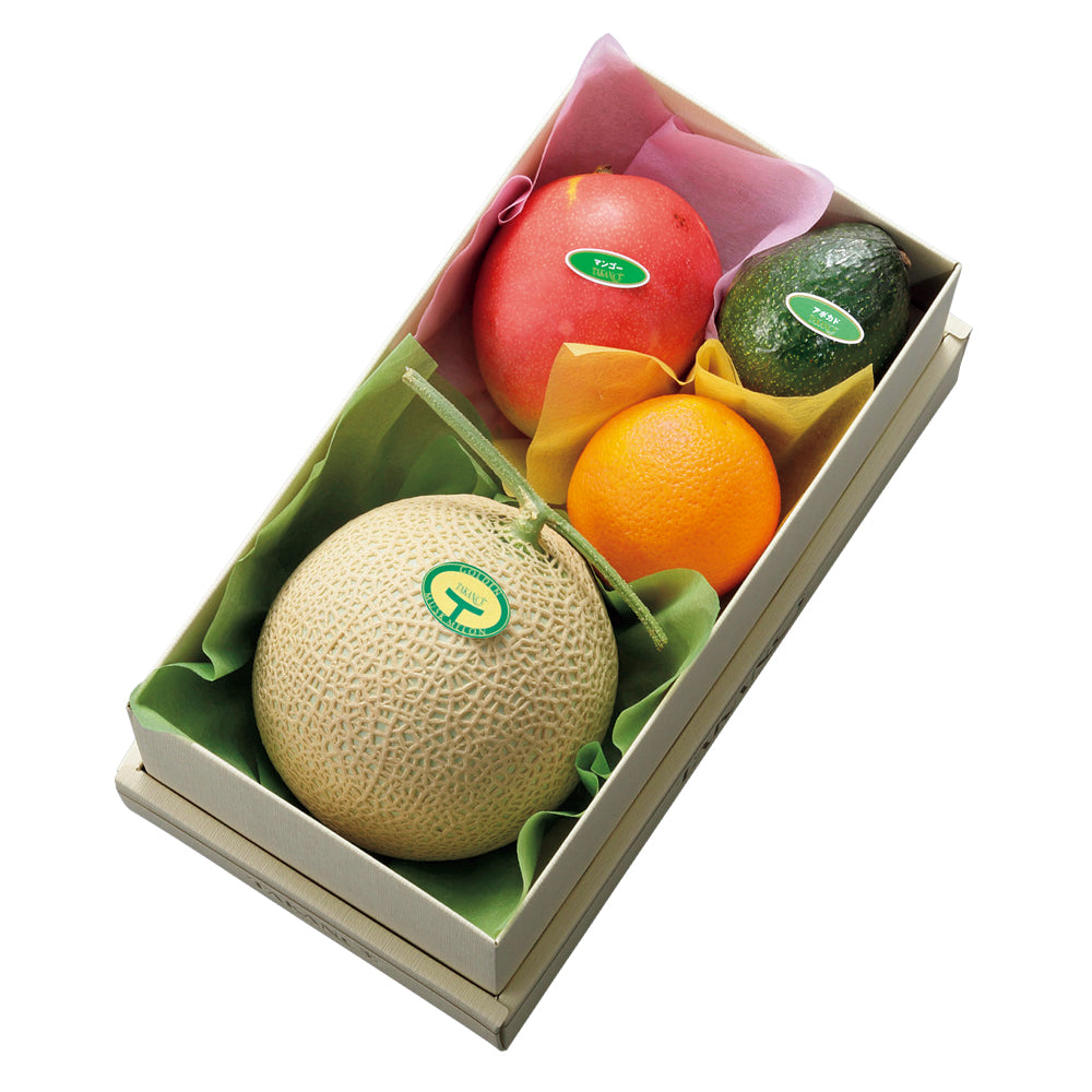 | 内容量 | マスクメロン(静岡県産)、マンゴー(ブラジル、ペルーまたはオーストラリア産)、オレンジ(アメリカまたはオーストラリア産)、アボカド(メキシコまたはチリ産)×各1 |
