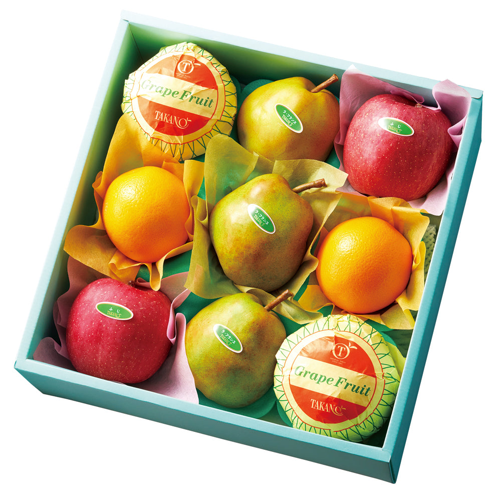 | 内容量 | ラ・フランス(山形県産)×3、ふじ(青森県、山形県、長野県または岩手県産)、グレープフルーツ(アメリカ、メキシコまたはオーストラリア産)、オレンジ(アメリカまたはオーストラリア産)×各2 |