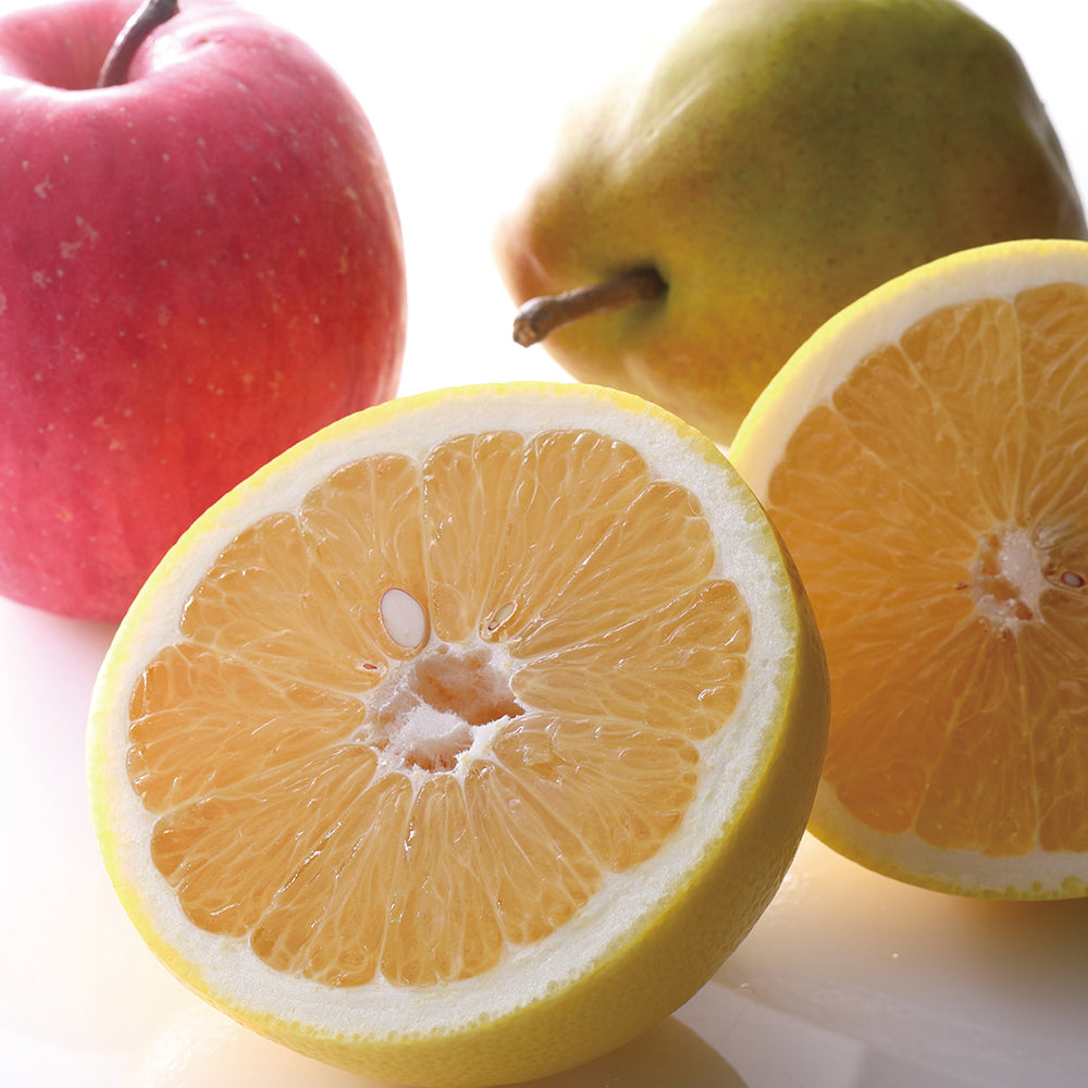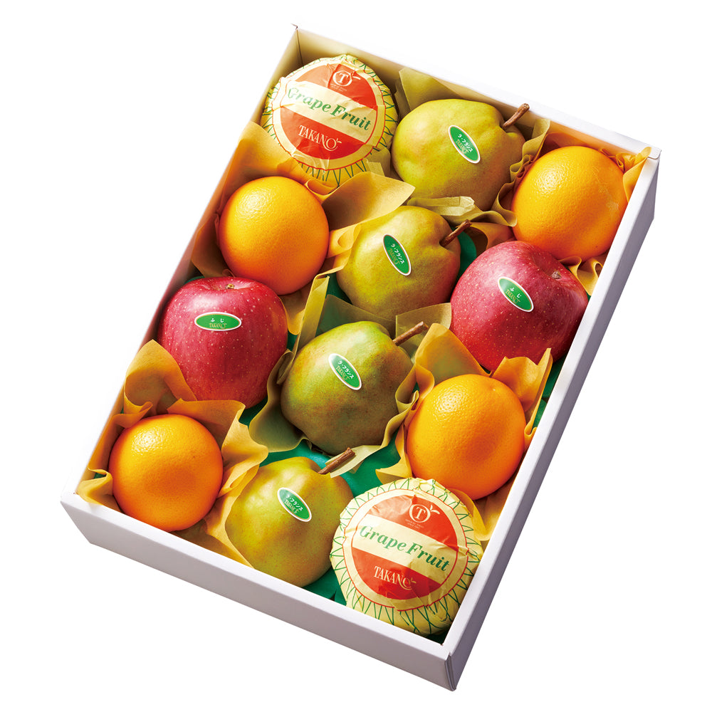 | 内容量 | ふじ(青森県、山形県、長野県または岩手県産)、グレープフルーツ(アメリカ、メキシコまたはオーストラリア産)×各2、ラ・フランス(山形県産)、オレンジ(アメリカまたはオーストラリア産)×各4 |
