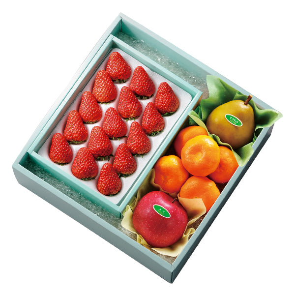 | 内容量 | 苺15粒(静岡県、佐賀県、栃木県、熊本県、千葉県、長崎県、福岡県または茨城県産)、ラ・フランス(山形県産)、ふじ(青森県、山形県、長野県または岩手県産)×各1、みかん(愛媛県、和歌山県または熊本県産)×5 |