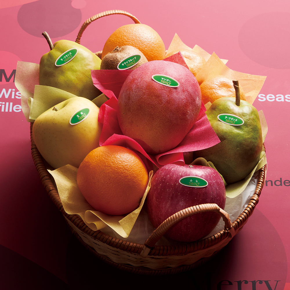 | 内容量 | ラ・フランス(山形県産)、オレンジ(アメリカまたはオーストラリア産)、みかん(愛媛県、和歌山県、熊本県または長崎県産)×各2、キウイフルーツ(ニュージーランド産)、ふじ(青森県、山形県、長野県または岩手県産)、王林(青森県、長野県、山形県、岩手県または秋田県産)、マンゴー(ブラジル、オーストラリアまたはペルー産)×各1 |