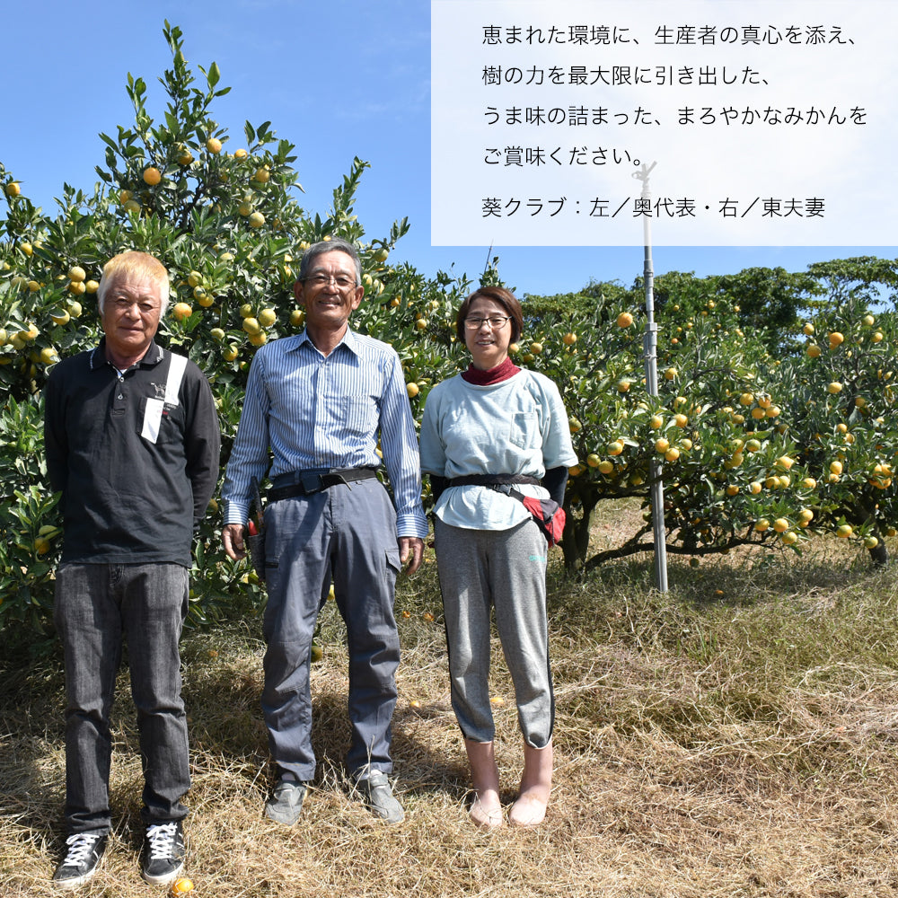 全国でも屈指のみかん栽培グループ「葵クラブ」が、独自の栽培法で育てたみかん。コクが深く、甘みと酸味のバランスがよく、果肉がぎっしり詰まっています。そのうえ生産量が限られているため、たいへん希少なみかんです。葵クラブはみかん作りに徹底したこだわりをもっています。健全な苗木での改植、鰹節工場から魚粕を取り寄せての有機栽培での栽培、木の健全化を図る有機アミノ酸液肥の散布、高畝(たかうね)栽培による高品質果実生産、収穫はみかん本来のうま味を引き出すため樹上で完熟してから。こうしてよくやく甘み酸味だけではない、コクのある葵クラブみかんは生まれるのです。※商品写真の中で使用されている器や小物類等は、演出用のため商品内容に含まれておりません。