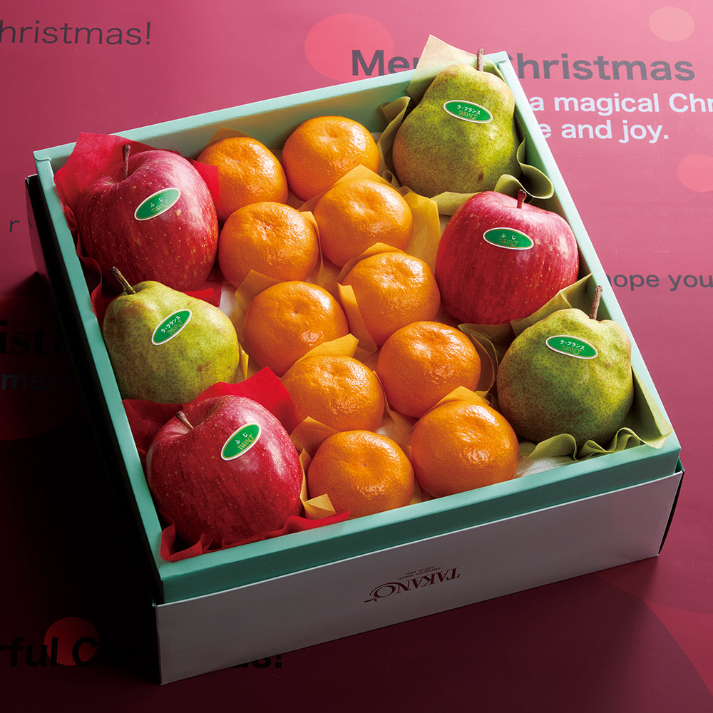 鮮やかなクリスマスカラーのフルーツとみずみずしいみかんをアソートしました。