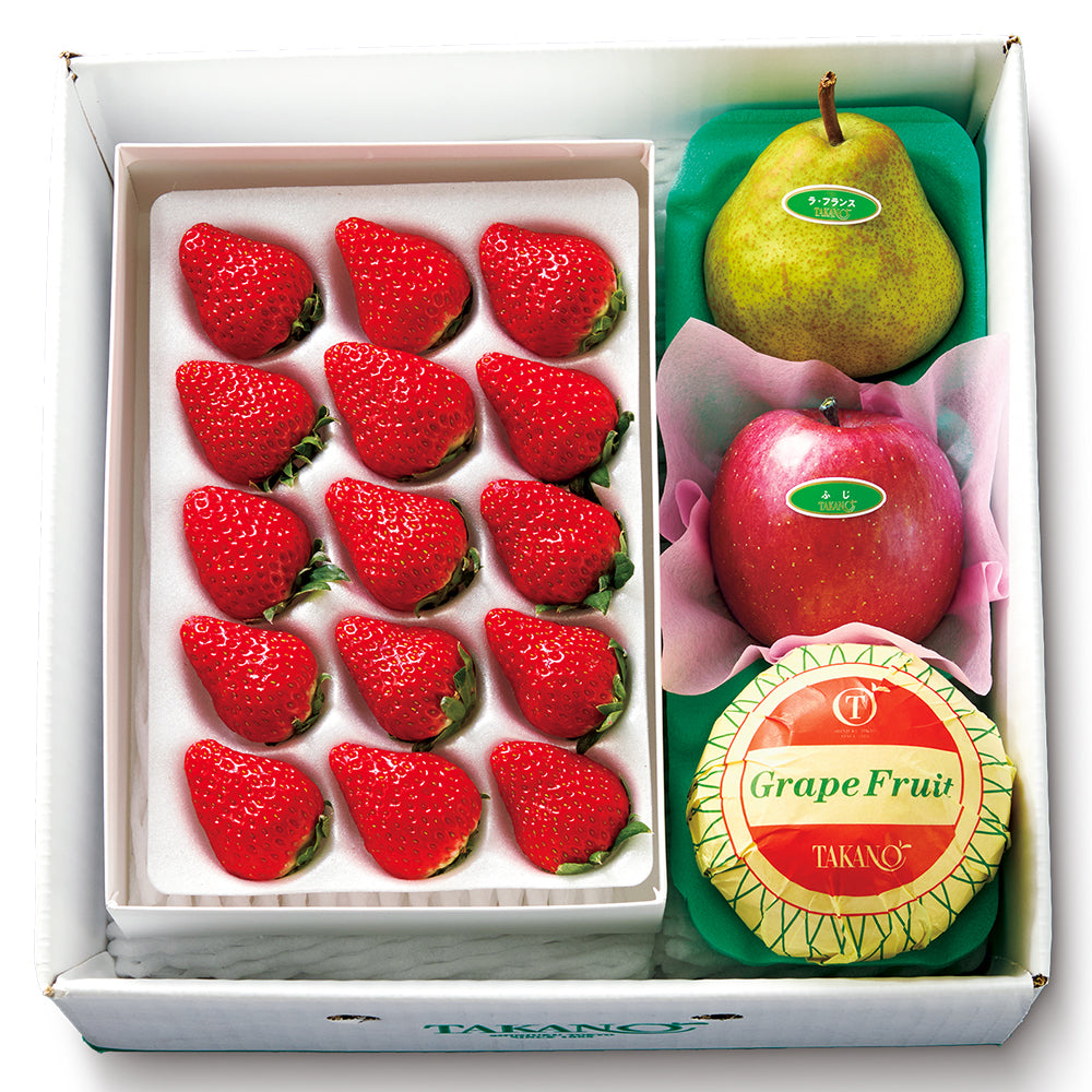 | 内容量 | 苺15または18粒(静岡県、佐賀県、栃木県、熊本県、千葉県、長崎県、福岡県または茨城県産)、ラ・フランス(山形県産)、ふじ(青森県、長野県または山形県産)、グレープフルーツ(アメリカ、メキシコまたはオーストラリア産)×各1 |