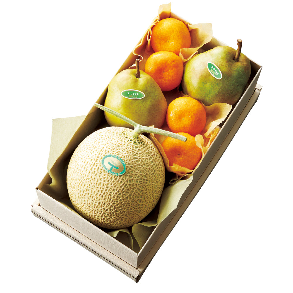 | 内容量 | マスクメロン(静岡県産)×1、ラ・フランス(山形県産)×2、みかん(愛媛県、和歌山県または熊本県産)×4 |
