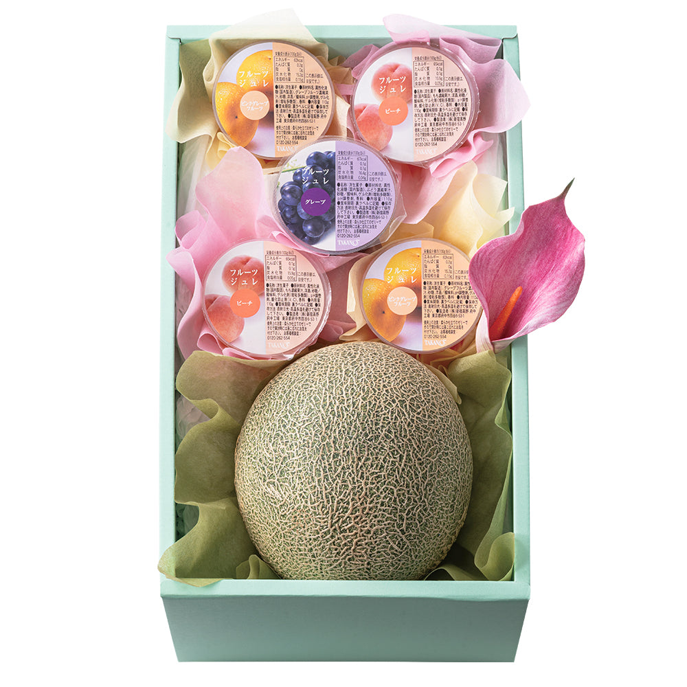 | 内容量 | メロン(熊本県、茨城県または千葉県産)×1、フルーツジュレ(グレープ×1、ピンクグレープフルーツ、ピーチ×各2)、カラーオーナメント×1 |