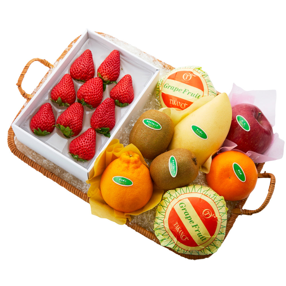 | 内容量 | 苺9粒(静岡県、佐賀県、栃木県、熊本県、千葉県、長崎県、福岡県、茨城県、徳島県または香川県産)、デコポン(佐賀県または熊本県産)、せとか(愛媛県または佐賀県産)、ふじ(青森県産)、タイマンゴー(タイ産)×各1、キウイフルーツ(ニュージーランド、愛媛県または和歌山県産)、グレープフルーツ(アメリカ、メキシコまたはオーストラリア産)×各2(篭入) |