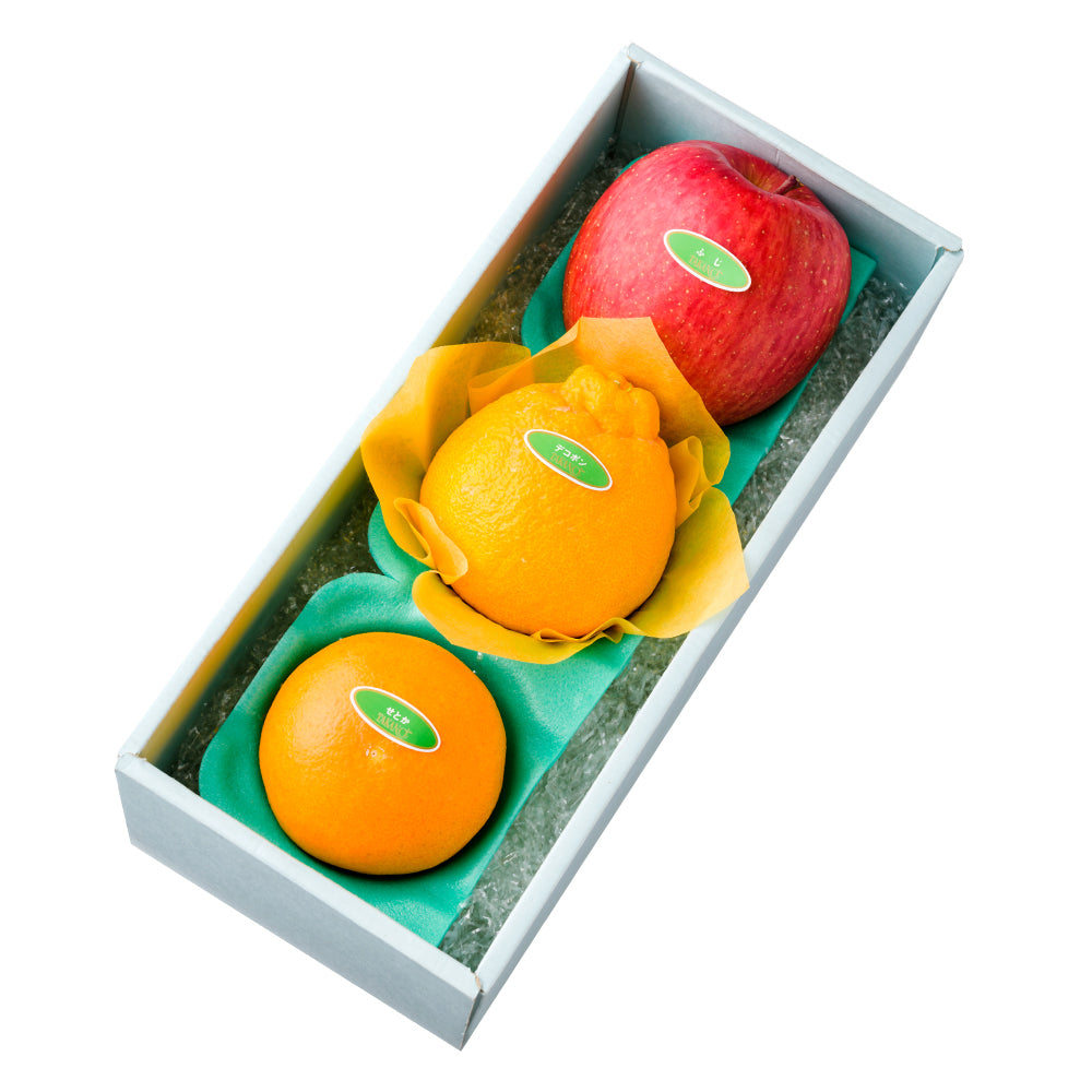 | 内容量 | デコポン®(熊本県または佐賀県産)、せとか(愛媛県または佐賀県産)、ふじ(青森県または長野県産)×各1 |