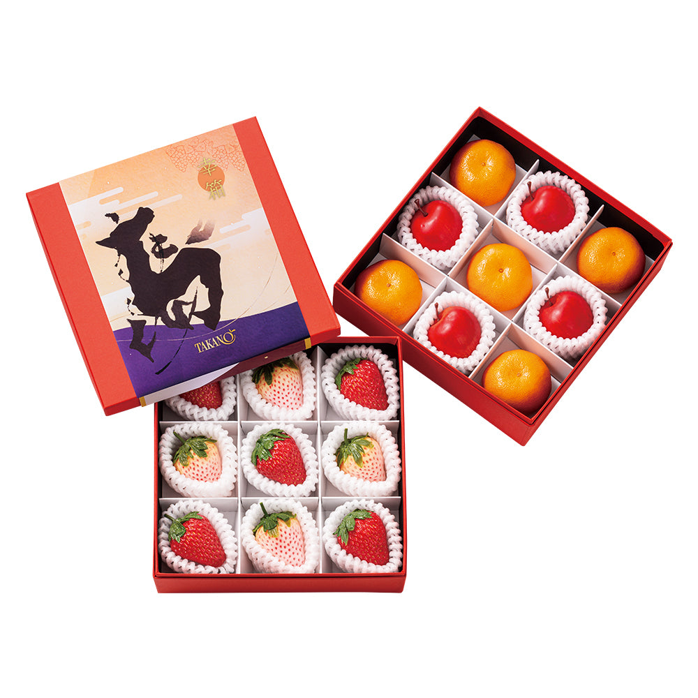 祝い事で使われる紅白を、赤と白の苺で表現。柑橘は、鏡餅の上に乗るミカン科の橙(だいだい)というもの。「代々」栄えるようにという語呂合わせから、縁起の良い柑橘としても知られています。食味の良いミニふじと合わせてお楽しみください。