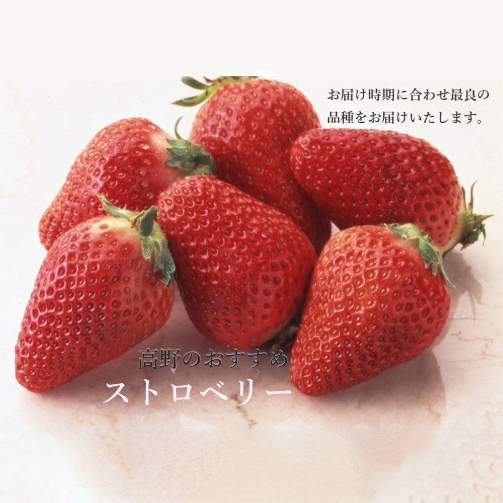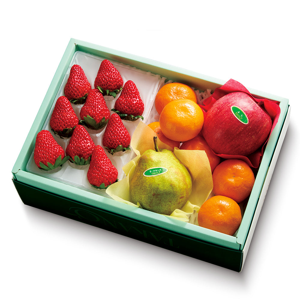 | 内容量 | 苺9粒(静岡県、佐賀県、栃木県、熊本県、千葉県、長崎県、茨城県または福岡県産)、ふじ(青森県、山形県、長野県または岩手県産)、ラ・フランス(山形県産)×各1、みかん(愛媛県、和歌山県、熊本県または長崎県産)×6 |