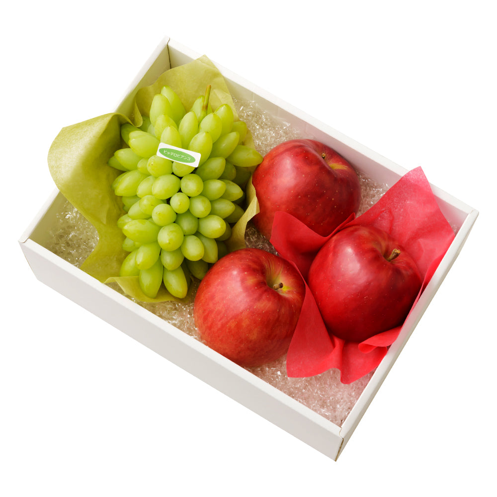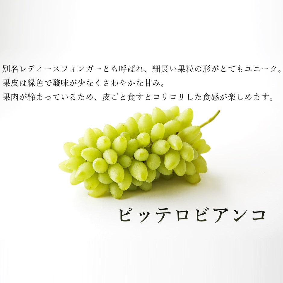 ■ピッテロビアンコはイタリア原産のぶどうです。粒の形から、別名:レディース フィンガー(淑女の指、貴婦人の小指)とも呼ばれています。皮ごと召し上がれ、シャリシャリとした食感とさっぱりとした甘みが特徴です。(種がある場合がございますのでお気を付けください)。■りんごは季節ごとに様々な品種が出回ります。その時期に一番良い状態の品種でご手配いたします。■季節のご挨拶ギフトなど幅広くご利用いただいております。特に「ご出産」「ご婚礼」などの「御祝」「内祝」ギフトとしてお勧めいたします。