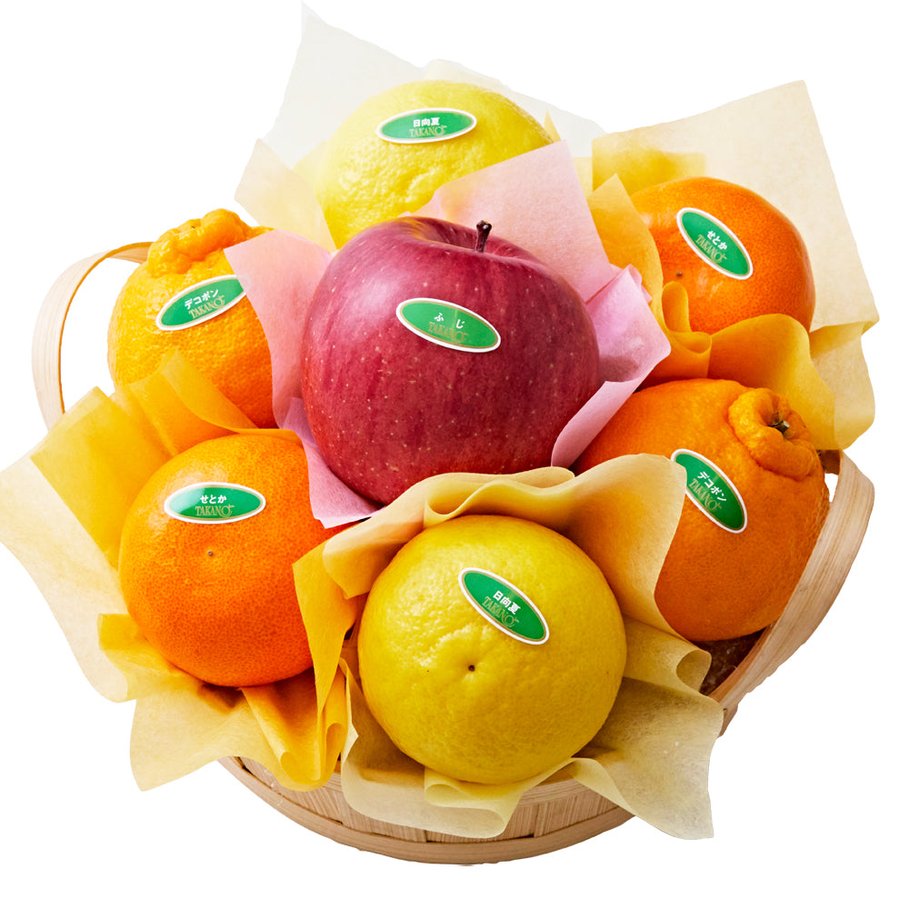 | 内容量 | デコポン(熊本県または佐賀県産)、せとか(愛媛県または佐賀県産)、日向夏(宮崎県産)×各2、ふじ(青森県または長野県産)×1(篭入) |