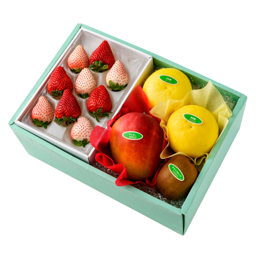 | 内容量 | 初恋の香り5粒(静岡県、和歌山県、鹿児島県または佐賀県産)、紅ほっぺ4粒(静岡県産)×各1、日向夏(宮崎県産)×2、マンゴー(ペルー、ブラジルまたはオーストラリア産)、キウイフルーツ(ニュージーランド、愛媛県、和歌山県、山梨県または福岡県産) ×各1 |