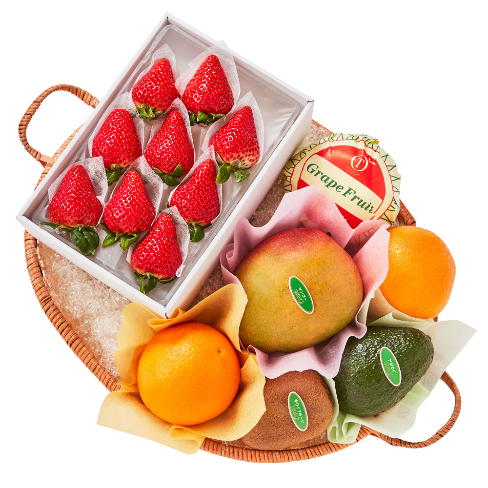 | 内容量 | さくらももいちご 9粒(徳島県産)×1、オレンジ(アメリカまたはオーストラリア産)×2、マンゴー(ペルーまたはメキシコ産)、アボカド(メキシコ産)、グレープフルーツ(オーストラリア、アメリカまたはメキシコ産)、キウイフルーツ(ニュージーランドまたは福岡県産)×各1(篭入) |