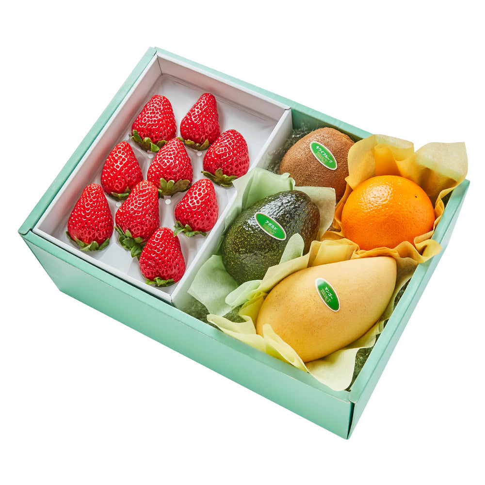 | 内容量 | まりひめいちご9粒 (和歌山県産)、タイマンゴー(タイ産)、アボカド(メキシコ産)、オレンジ(アメリカまたはオーストラリア産)、キウイフルーツ(ニュージーランド、愛媛県または和歌山県産)×各1 |