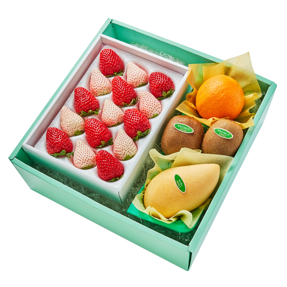 | 内容量 | まりひめいちご8粒 (和歌山県産)、初恋の香り7粒(静岡県、和歌山県または山口県産)、タイマンゴー(タイ産)、オレンジ(アメリカまたはオーストラリア産)×各1、キウイフルーツ(ニュージーランド、愛媛県、和歌山県、山梨県または福岡県産)×各2 |