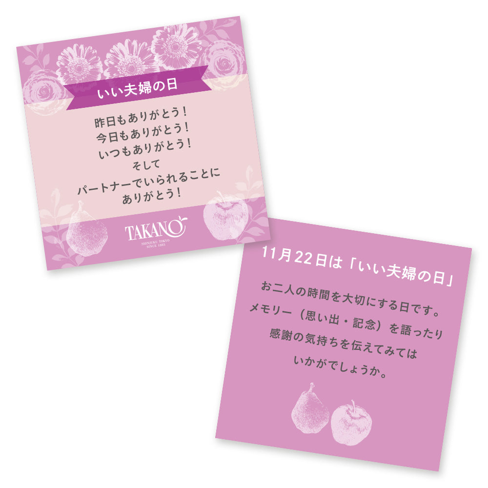 11月22日(土)はいい夫婦の日。1988年に財団法人余暇開発センターによって設定されました。夫婦がより一層ステキな関係でいられますようにといった願いを込めて作られました。感謝の気持ちや愛情を、妻・夫・パートナー・ご両親に伝えるきっかけにお役に立てましたら幸いです。*インターネット限定/お得な送料込みで「いい夫婦の日メッセージカード」もお付けいたします。