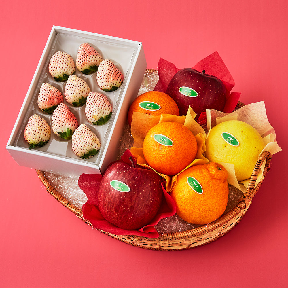 | 内容量 | 初恋の香り9粒(静岡県、和歌山県または山口県産)×1、せとか(愛媛県または佐賀県産)、ふじ(青森県または長野県産)×各2、デコポン(熊本県または佐賀県産)、日向夏(宮崎県産)×各1(篭入) |