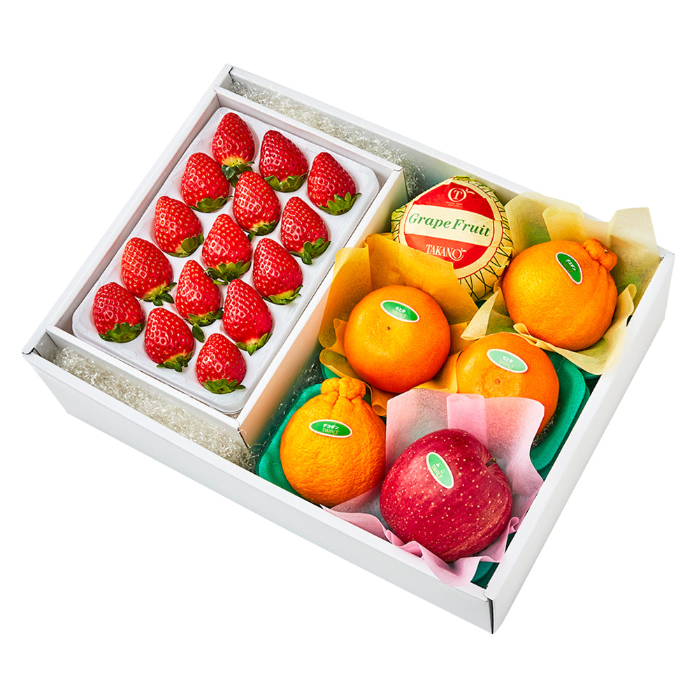 | 内容量 | まりひめいちご15粒(和歌山県産)×1、デコポン®(佐賀県または熊本県産)、せとか(愛媛県または佐賀県産)×各2、りんご(青森県または長野県産)、グレープフルーツ(アメリカ、メキシコ、トルコまたはオーストラリア産)×各1 |