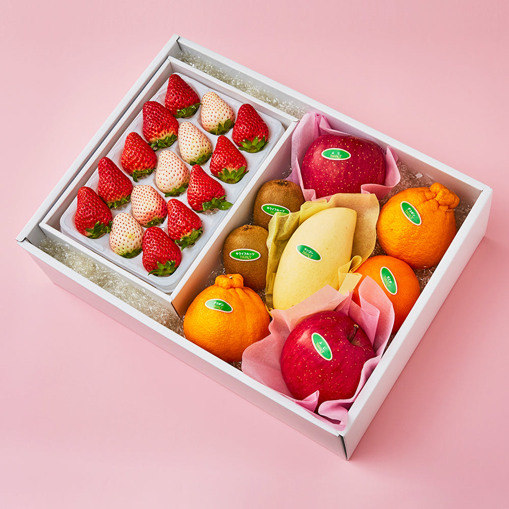 | 内容量 | 苺10粒(静岡県、佐賀県、栃木県、熊本県、千葉県、長崎県、福岡県、和歌山県または茨城県産)、初恋の香り5粒(静岡県、和歌山県または山口県産)×1、デコポン®(熊本県または佐賀県産)、ふじ(青森県または長野県産)、キウイフルーツ(ニュージーランドまたは福岡県産)×各2、せとか(愛媛県産または佐賀県産)、タイマンゴー(タイ産)×各1 |