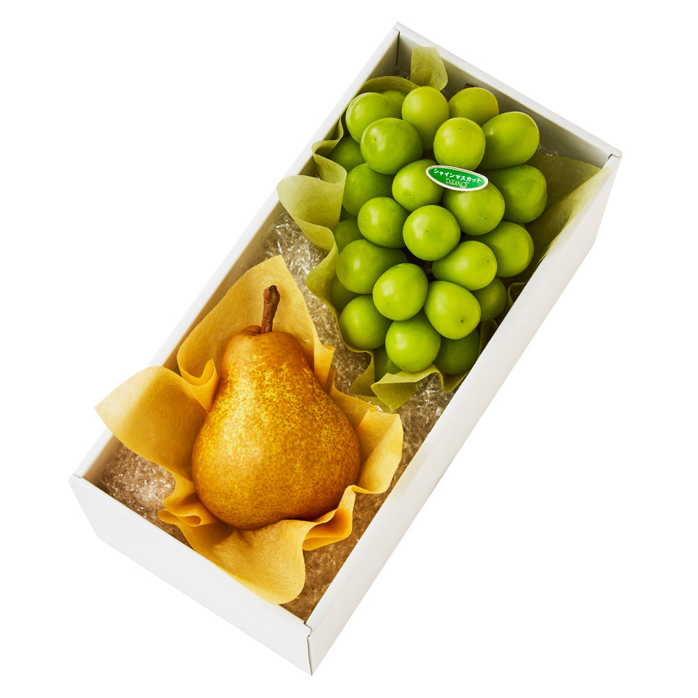| 内容量 | 洋梨(山形県、長野県、青森県または宮城県産)、シャインマスカット(長野県または山梨県産)×各1 | ||