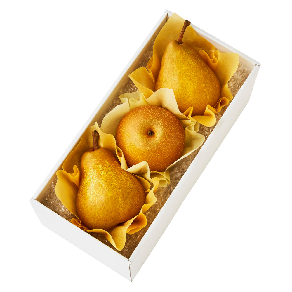 内容量 | 洋梨(山形県、長野県、青森県または宮城県産)×2、和梨(長野県、栃木県、茨城県または新潟県産)×1 | ||