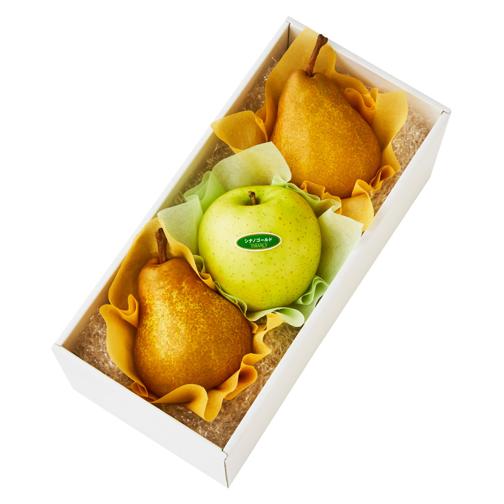 | 内容量 | 洋梨(山形県、長野県、青森県または宮城県産)×2、シナノゴールドまたはとき(長野県、岩手県、山形県または青森県産)×1 | ||