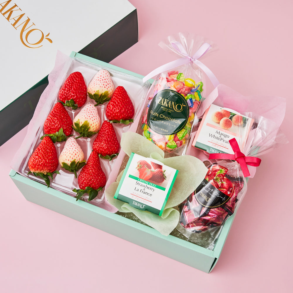 | 内容量 | 苺6粒(静岡県、佐賀県、栃木県、熊本県、千葉県、長崎県、福岡県または茨城県産)、初恋の香り3粒(静岡県、和歌山県、鹿児島県または佐賀県産)×1、ストロベリーチョコレートSPリボン55g(個包装紙込み)、フルーツチョコレートSPリボン80g(個包装紙込み)×各1、クリスタルデュオ(マンゴープリン&白桃ゼリー、ストロベリープリン&ラ・フランスゼリー×各1) |