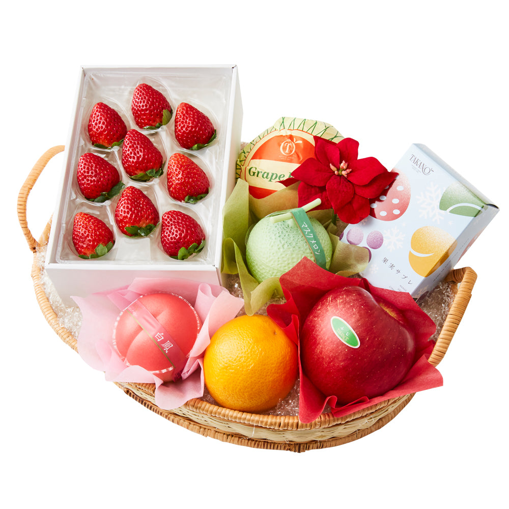 | 内容量 | 苺9粒(静岡県、佐賀県、栃木県、熊本県、千葉県、長崎県、福岡県または茨城県産)、ふじ(青森県、山形県、長野県または岩手県産)、グレープフルーツ(アメリカ、メキシコまたはオーストラリア産)、オレンジ(アメリカまたはオーストラリア産)、果実サブレ ウインターパッケージ×各1、果実ピュアゼリー(マスクメロン、白鳳×各1)、ポインセチア(造花)×1(篭入) |