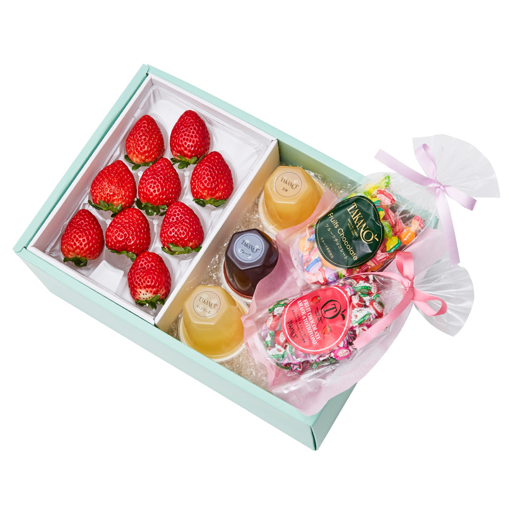 | 内容量 | 苺9粒(静岡県、佐賀県、栃木県、熊本県、千葉県、長崎県、福岡県または茨城県産)×1、果実ゼリー(ラ・フランス、グレープ、アルフォンソマンゴー×各1)、フルーツチョコレートSPリボン80g(個包装紙込み)、あまおう&とちおとめチョコレートSPリボン65g(個包装紙込み)×各1 |