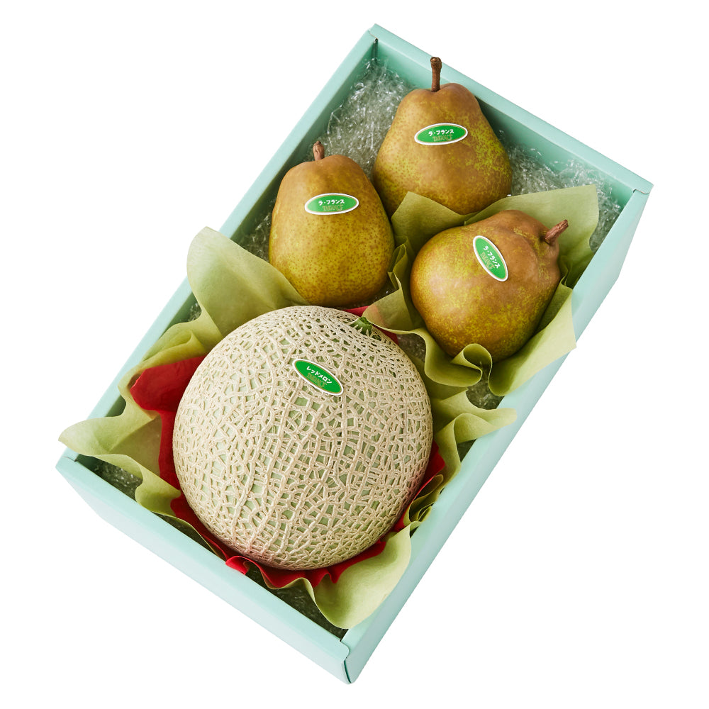 | 内容量 | レッドメロン(熊本県、長崎県、宮崎県または高知県産)×1、ラ・フランス(山形県または青森県産)×3 |