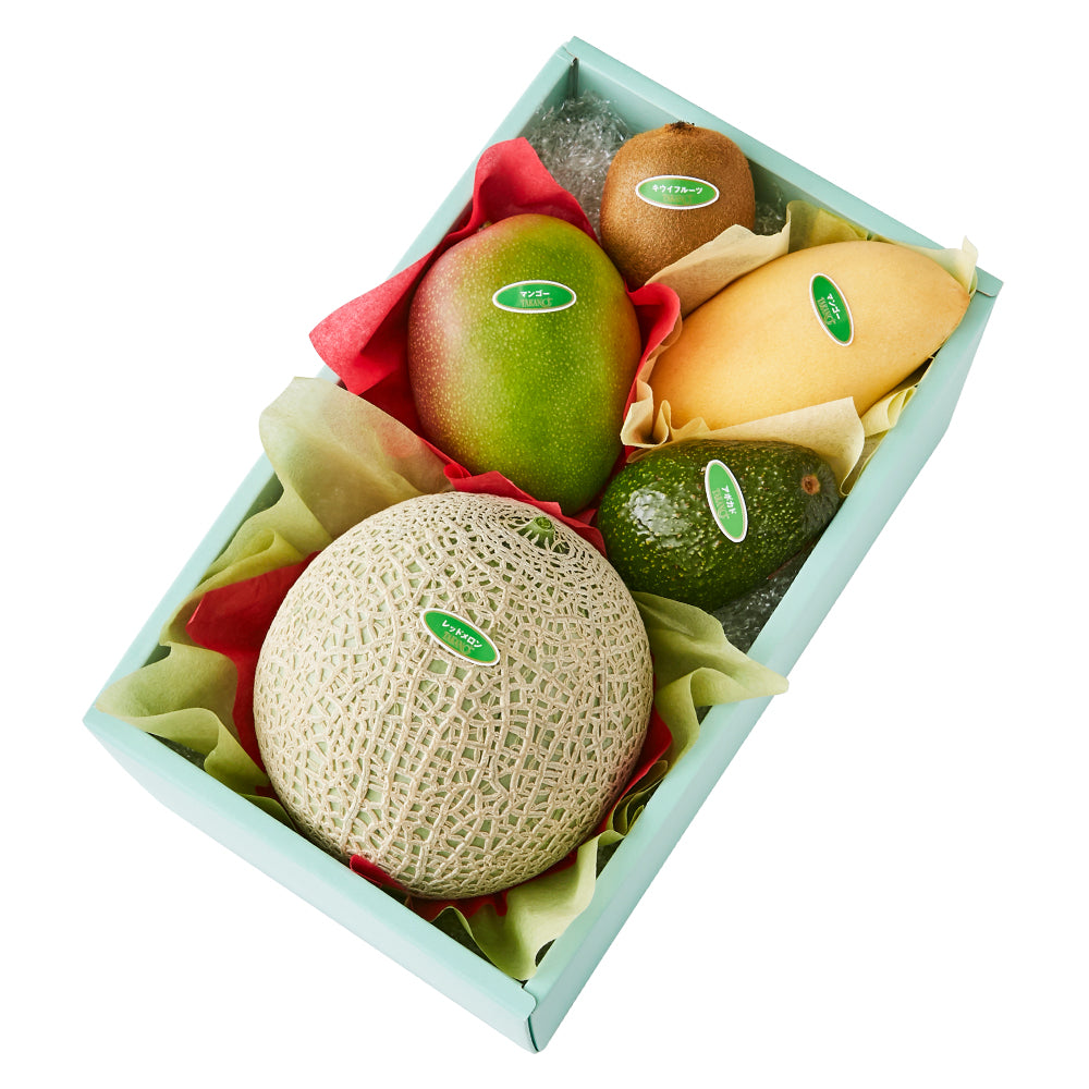 | 内容量 | レッドメロン(熊本県、長崎県、宮崎県または高知県産)×1、マンゴー(ブラジル、ペルーまたはオーストラリア産)、タイマンゴー(タイ産)、アボカド(メキシコ産)、キウイフルーツ(ニュージーランド産)×各1 |