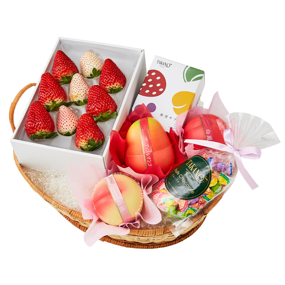 | 内容量 | 苺6粒(静岡県、佐賀県、栃木県、熊本県、千葉県、長崎県、茨城県または福岡県産)、初恋の香り3粒(静岡県、和歌山県、熊本県または佐賀県産)×1、果実ピュアゼリー(白桃、白鳳、アップルマンゴー×各1)、果実サブレ5枚入×1、フルーツチョコレートSPリボン80g(個包装紙込み)×1(篭入) |