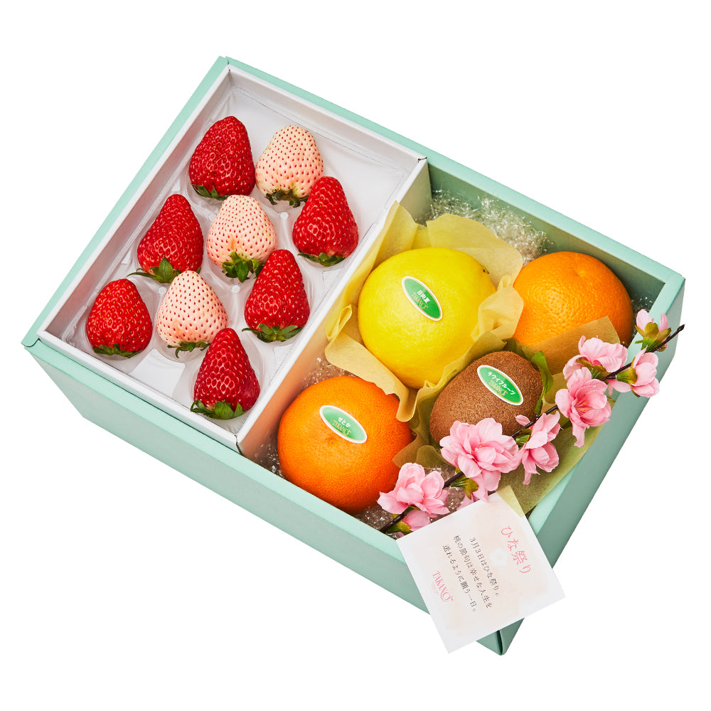 | 内容量 | 苺6粒(静岡県、佐賀県、栃木県、熊本県、千葉県、長崎県、茨城県または福岡県産)×1、初恋の香り3粒(静岡県、和歌山県、熊本県または佐賀県産)×1、せとか(愛媛県または佐賀県産)、オレンジ(アメリカまたはオーストラリア産)、日向夏(宮崎県産)、キウイフルーツ(愛媛県、和歌山県または福岡県産)×各1、桃の花(造花)×1 |