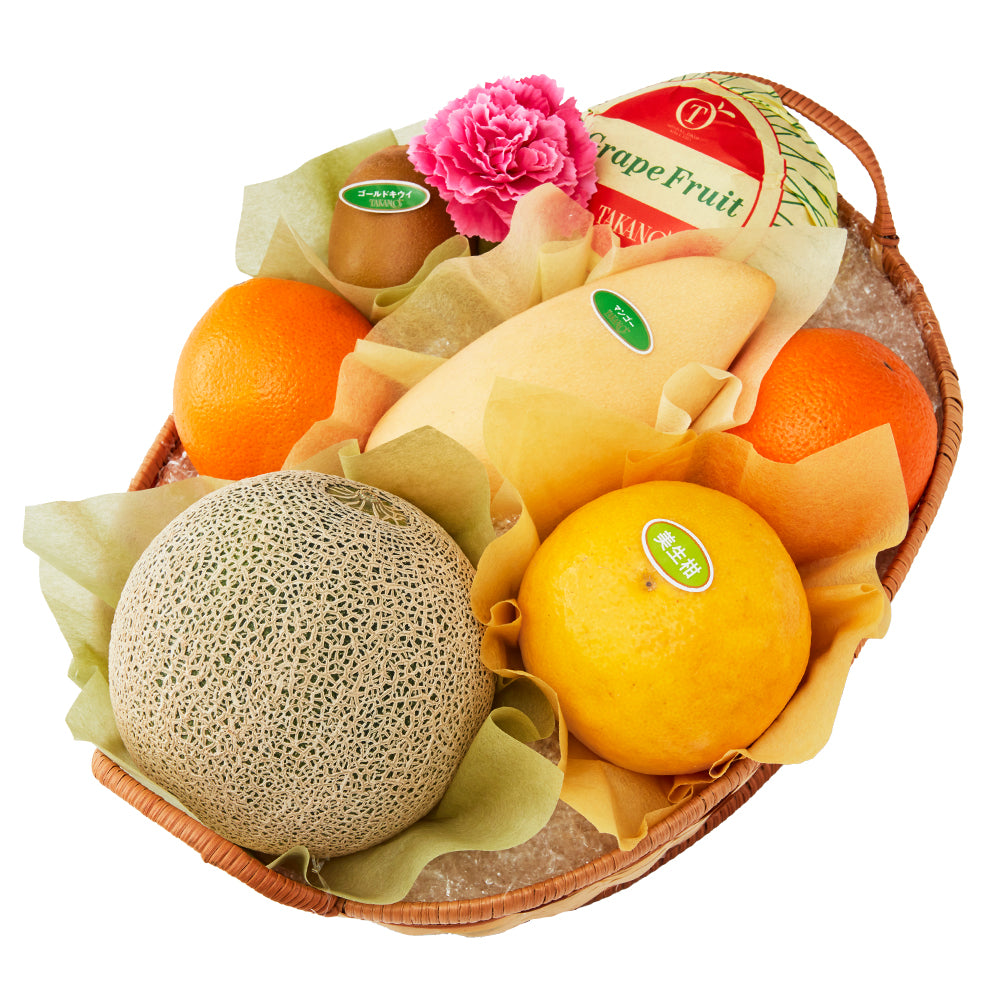| 内容量 | メロン(熊本県、茨城県または千葉県産)、美生柑(愛媛県または熊本県産)、マンゴー(タイ産)、サンゴールドキウイ(ニュージーランド産)、グレープフルーツ(アメリカ、メキシコまたはトルコ産)×各1、オレンジ(アメリカ産)×2、カーネーション(造花)×1(篭入) |