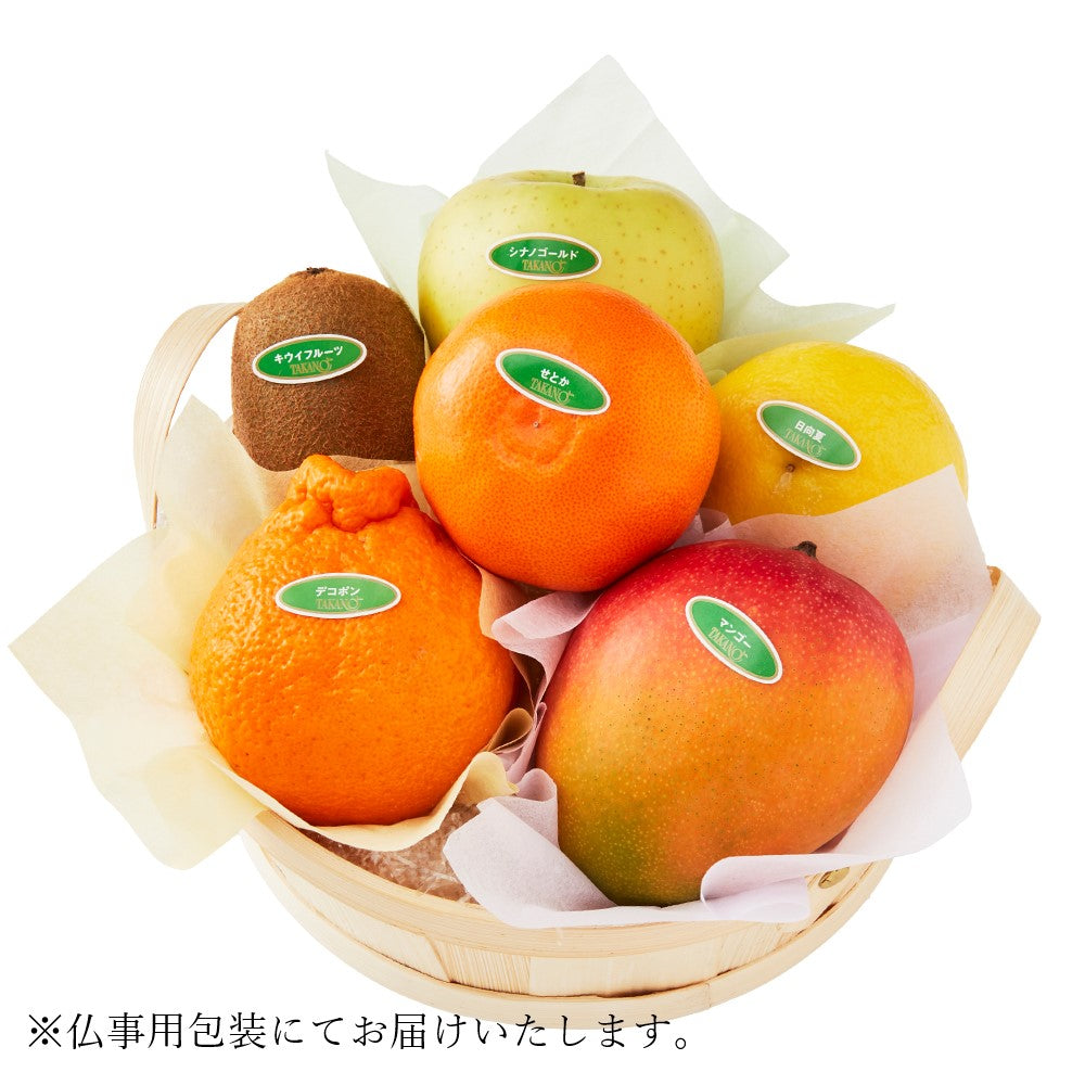 | 内容量 | デコポン®(佐賀県、熊本県または鹿児島県産)、せとか(佐賀県、愛媛県または愛知県産)、日向夏(宮崎県産)、シナノゴールド(青森県または長野県産)、マンゴー(ペルー、ブラジルまたはオーストラリア産)、キウイフルーツ(ニュージーランド、愛媛県または和歌山県産)×各1(篭入) |