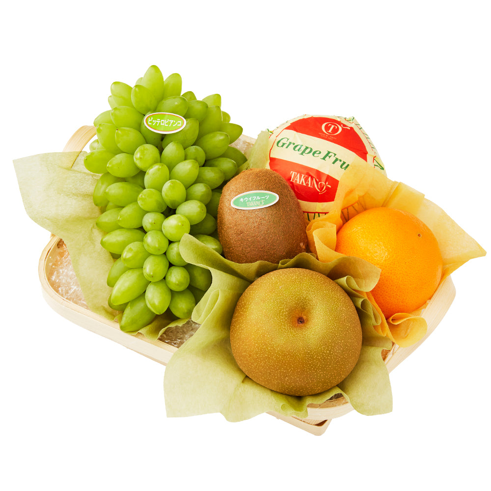 内容量 | ピッテロビアンコ 約600g前後(山梨県産)、和梨(千葉県、茨城県、栃木県、福島県、新潟県または長野県産)、グレープフルーツ(南アフリカまたはアメリカ産)、キウイフルーツ(ニュージーランド産)、オレンジ(アメリカ産)×各1(篭入) | ||