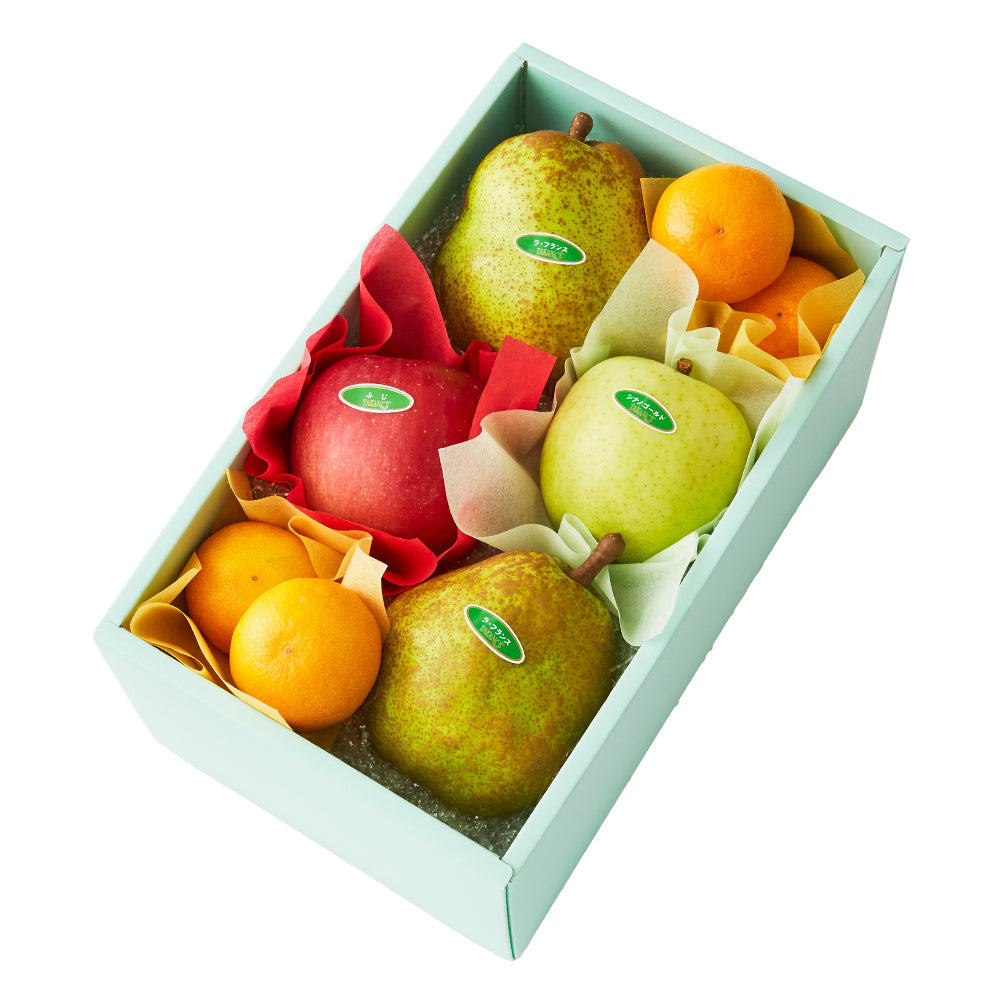 | 内容量 | 大玉ラ・フランス(山形県産)×2、シナノゴールド(長野県、山形県、岩手県または青森県産)、ふじ(青森県、山形県または長野県産)×各1、みかん(佐賀県、愛媛県、熊本県または和歌山県産)×4 |