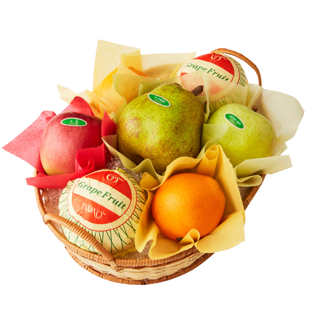 | 内容量 | 大玉ラ・フランス(山形県産)、ふじ(青森県、山形県または長野県産)、シナノゴールド(長野県、山形県、岩手県または青森県産)×各1、グレープフルーツ(南アフリカ、メキシコまたはオーストラリア産)、オレンジ(南アフリカまたはオーストラリア産)×各2(篭入) |