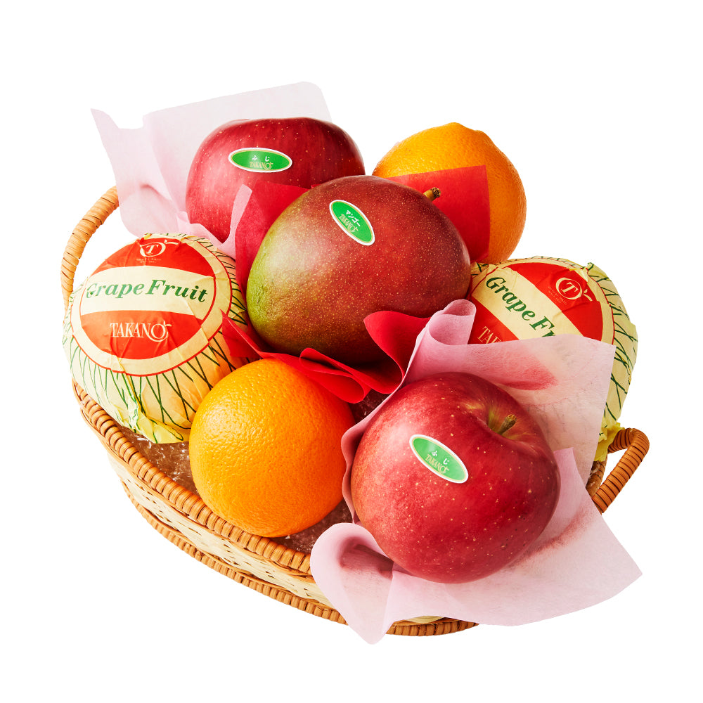 | 内容量 | マンゴー(ブラジル、ペルーまたはオーストラリア産)×1、ふじ(青森県、山形県、長野県または岩手県産)、グレープフルーツ(アメリカ、メキシコまたはオーストラリア産)、オレンジ(アメリカまたはオーストラリア産)×各2(篭入) |