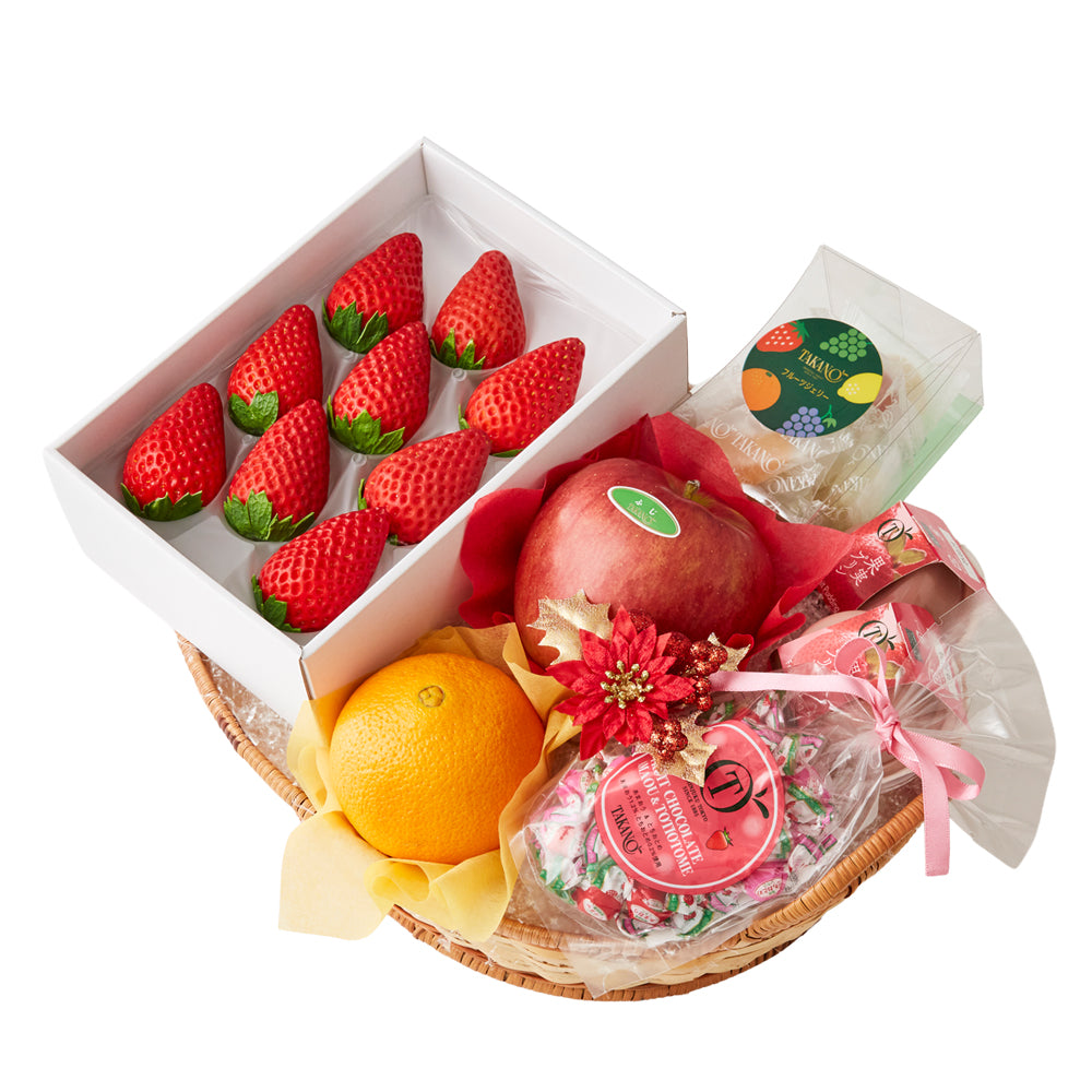 | 内容量 | 苺9粒(静岡県、佐賀県、栃木県、熊本県、千葉県、長崎県、福岡県または茨城県産)×1、ふじ(青森県、山形県、長野県または岩手県産)、オレンジ(アメリカまたはオーストラリア産)×各1、あまおう&とちおとめチョコレートSPリボン65g(個包装紙込み)、フルーツジェリー×各1、果実プリン(あまおう)×2、オーナメント×1(篭入) |
