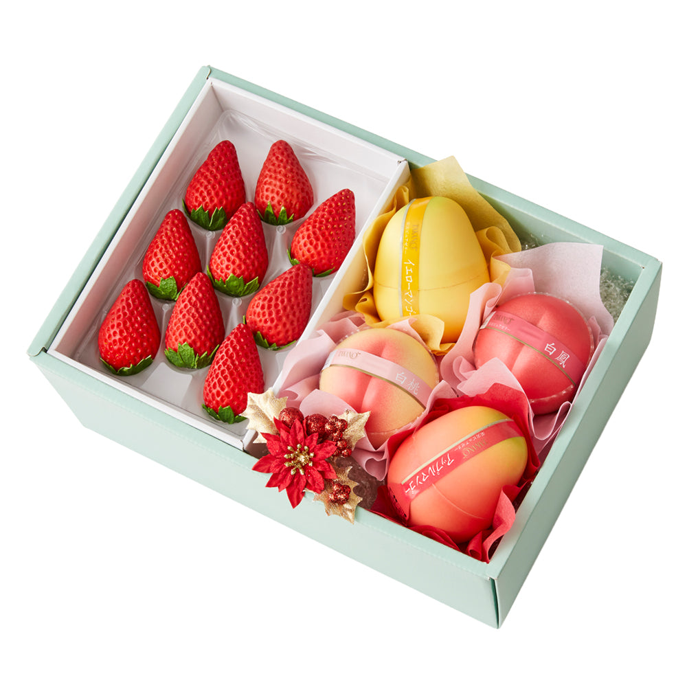 | 内容量 | 苺9粒(静岡県、佐賀県、栃木県、熊本県、千葉県、長崎県、福岡県または茨城県産)×1、果実ピュアゼリー(白桃、白鳳、アップルマンゴー、イエローマンゴー×各1)、オーナメント×1 |