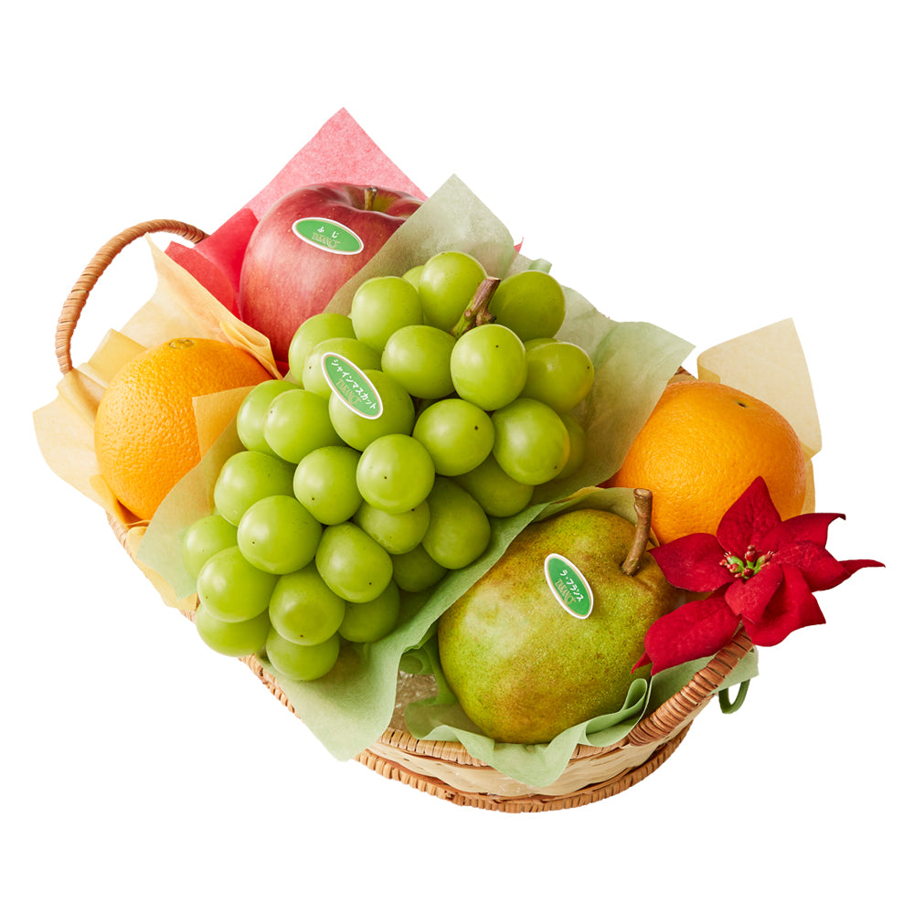 | 内容量 | シャインマスカット600g(長野県産)、ラ・フランス(山形県産)、ふじ(青森県、山形県、長野県または岩手県産)×各1、オレンジ(アメリカ産またはオーストラリア産)×2、ポインセチア(造花)×1(篭入) |