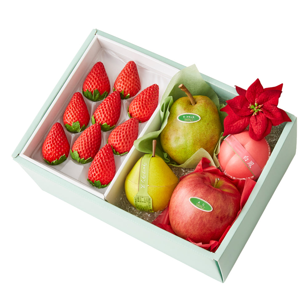 | 内容量 | 苺9粒(静岡県、佐賀県、栃木県、熊本県、千葉県、長崎県、福岡県または茨城県産)、ふじ(青森県、山形県、長野県または岩手県産)、ラ・フランス(山形県産)×各1、果実ピュアゼリー(ラ・フランス、白鳳×各1)、ポインセチア(造花)×1 |