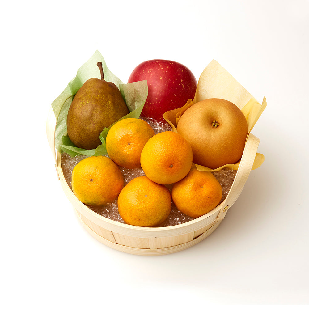 | 内容量 | みかん(佐賀県産)×5、りんご(長野県、山形県、秋田県または青森県産)、洋梨(長野県、山形県または青森県産)、和梨(千葉県、長野県または栃木県産)×各1(篭入) | ||