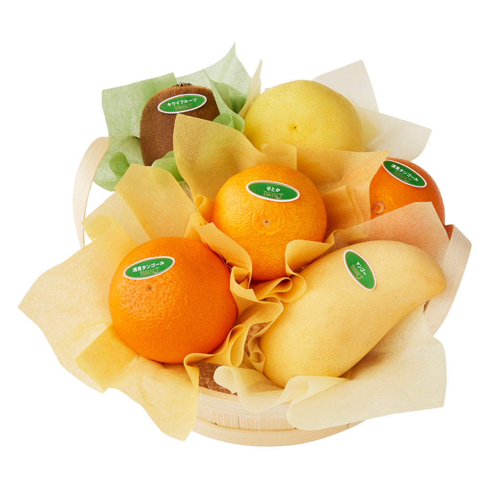 | 内容量 | タイマンゴー(タイ産)、せとか(愛媛県または佐賀県産)、キウイフルーツ(愛媛県、和歌山県または福岡県産)、湘南ゴールド(神奈川県産)×各1、清見オレンジ(愛媛県または佐賀県産)×2(篭入) |