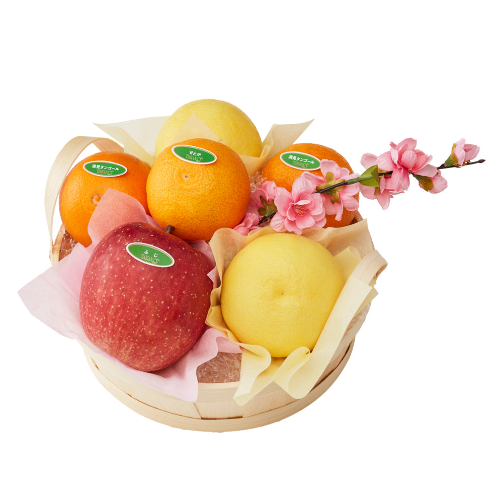 | 内容量 | ふじ(長野県、山形県または青森県産)、せとか(愛媛県または佐賀県産)×各1、清見オレンジ(愛媛県または佐賀県産)、湘南ゴールド(神奈川県産)×各2、桃の花(造花)×1(篭入) |