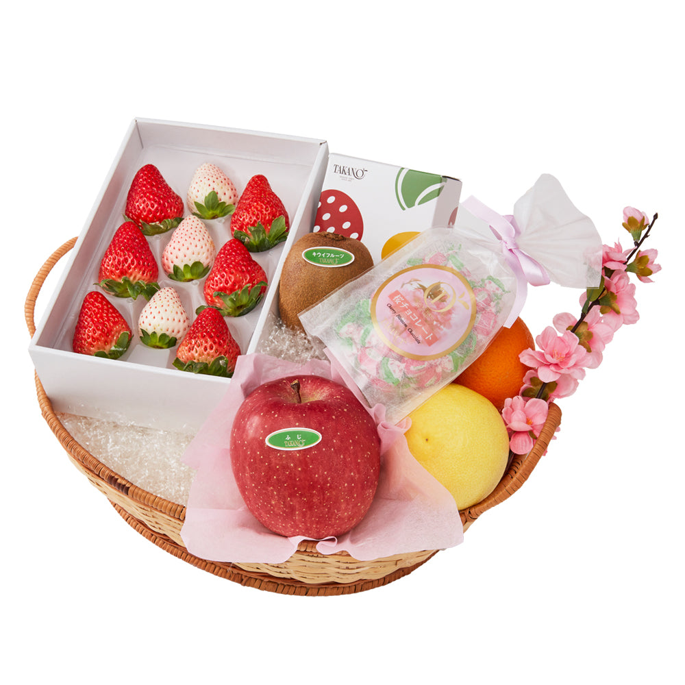 | 内容量 | 苺6粒(静岡県、佐賀県、栃木県、熊本県、千葉県、長崎県、茨城県または福岡県産)×1、初恋の香り3粒(静岡県、和歌山県、熊本県または佐賀県産)×1、湘南ゴールド(神奈川県産)×1、ふじ(長野県、山形県または青森県産)×1、オレンジ(アメリカまたはオーストラリア産)×1、キウイフルーツ(愛媛県、和歌山県または福岡県産)×1、果実サブレ5枚入×1、桜チョコレートSPリボン65g(個包装紙込み)×1、桃の花(造花)×1(篭入) |