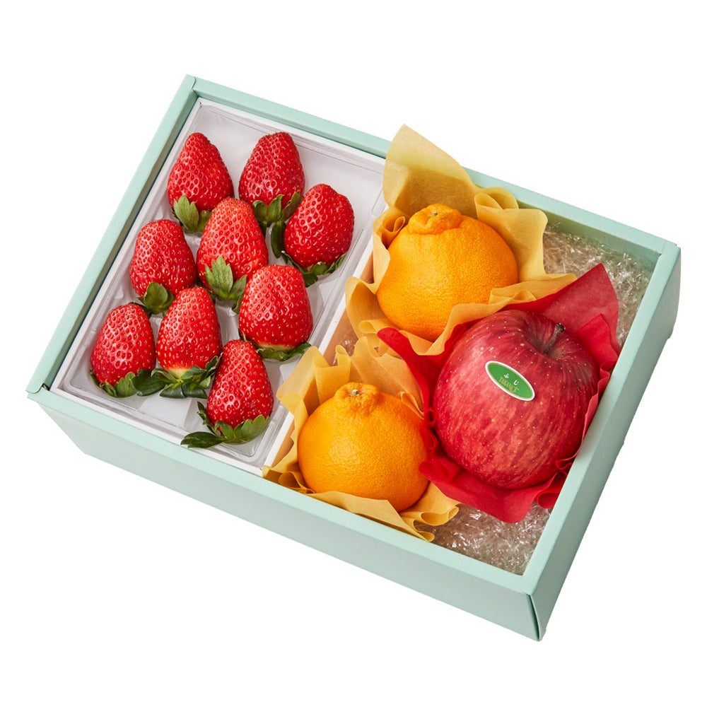 | 内容量 | 大将季(鹿児島県産)×2、苺9粒(静岡県、佐賀県、栃木県、熊本県、千葉県、長崎県、福岡県または茨城県産)×1、ふじ(青森県または長野県産)×1 |