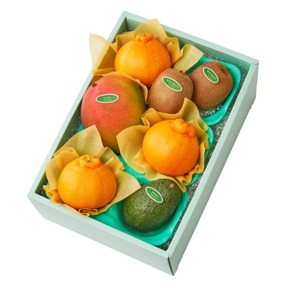| 内容量 | 大将季(鹿児島県産)×3、キウイフルーツ(ニュージーランド、愛媛県または和歌山県産)×2、マンゴー(ペルー、ブラジルまたはオーストラリア産)、アボカド(メキシコ産)×各1 |